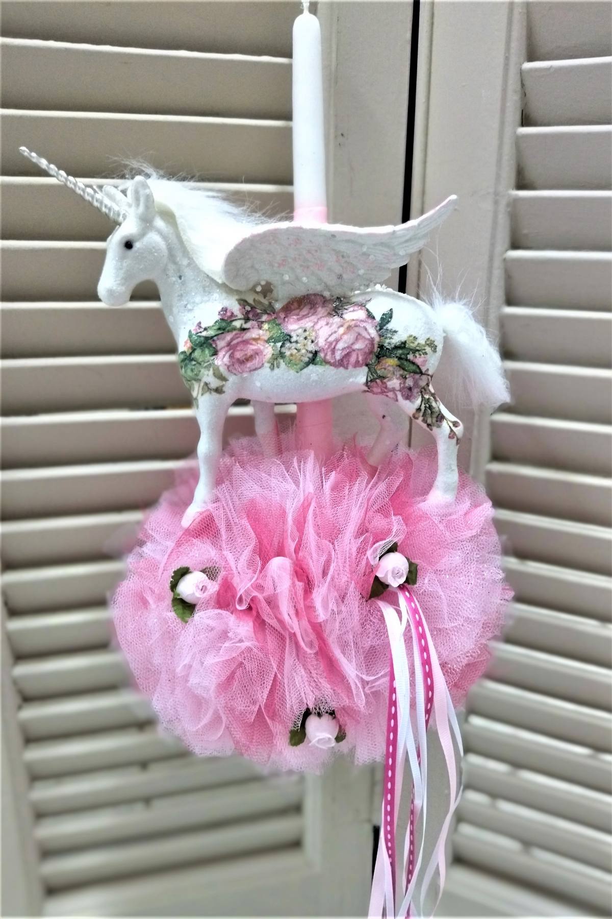 Λαμπάδα αρωματική 37εκ. διακοσμημένη με μονόκερο floral , μεγάλο pon pon από τούλι και στολισμένη με ασορτί κορδέλες και λουλούδι