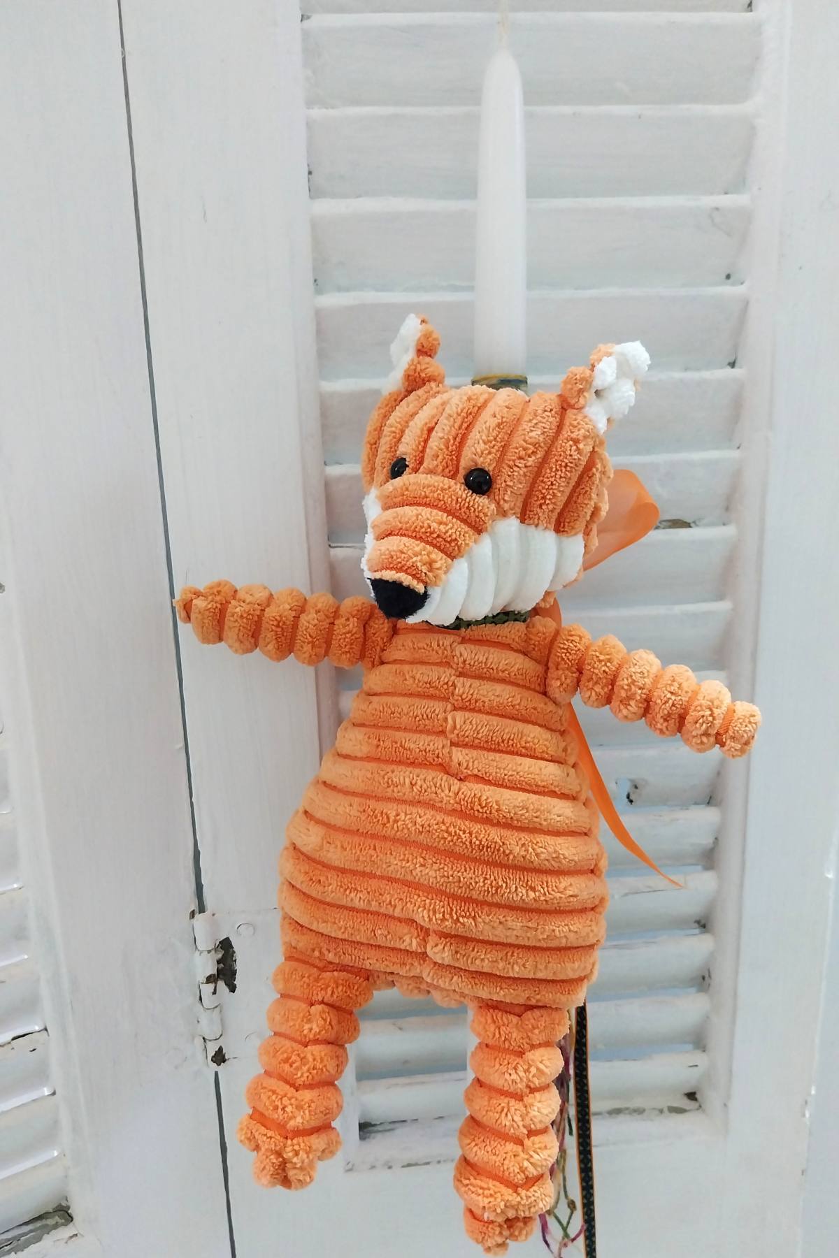Λαμπάδα 40εκ. στολισμένη με κοτλέ ζωακι αλεπού στολισμένη με ασορτί κορδέλες