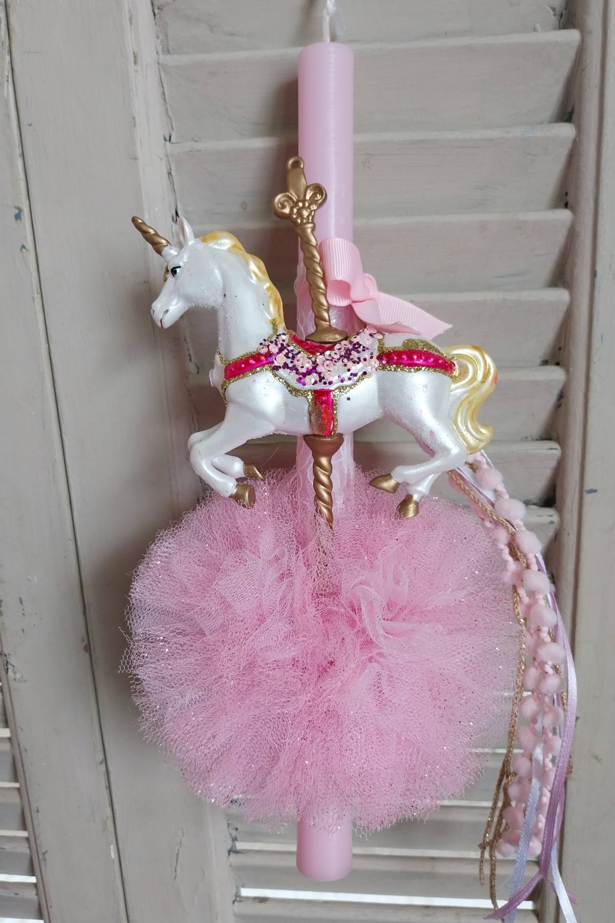 Λαμπάδα αρωματική με πολυεστερική φιγούρα , πον πον από τούλι και ασορτί κορδέλες