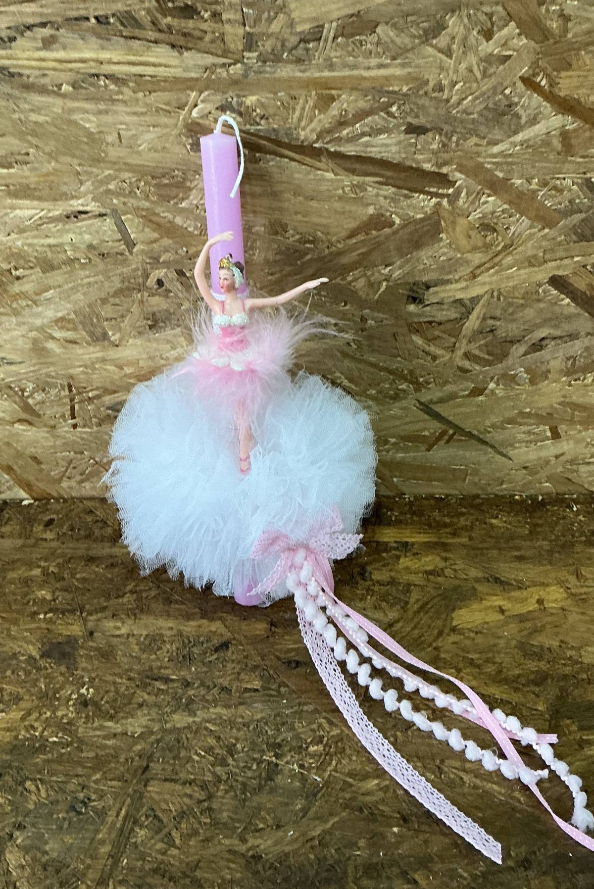 Λαμπαδο 31εκ. διακοσμημένη με μπαλαρίνα , pon pon και στολισμένη με ασορτί κορδέλες