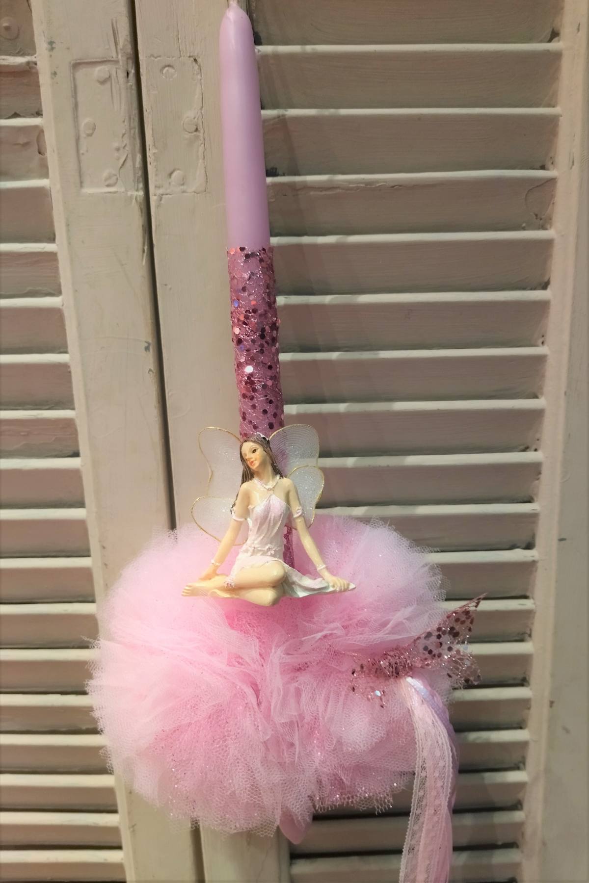 Λαμπάδα 33εκ. διακοσμημένη με πολυεστερική νεράιδα πάνω σε pon pon και στολισμένη με κορδέλες
