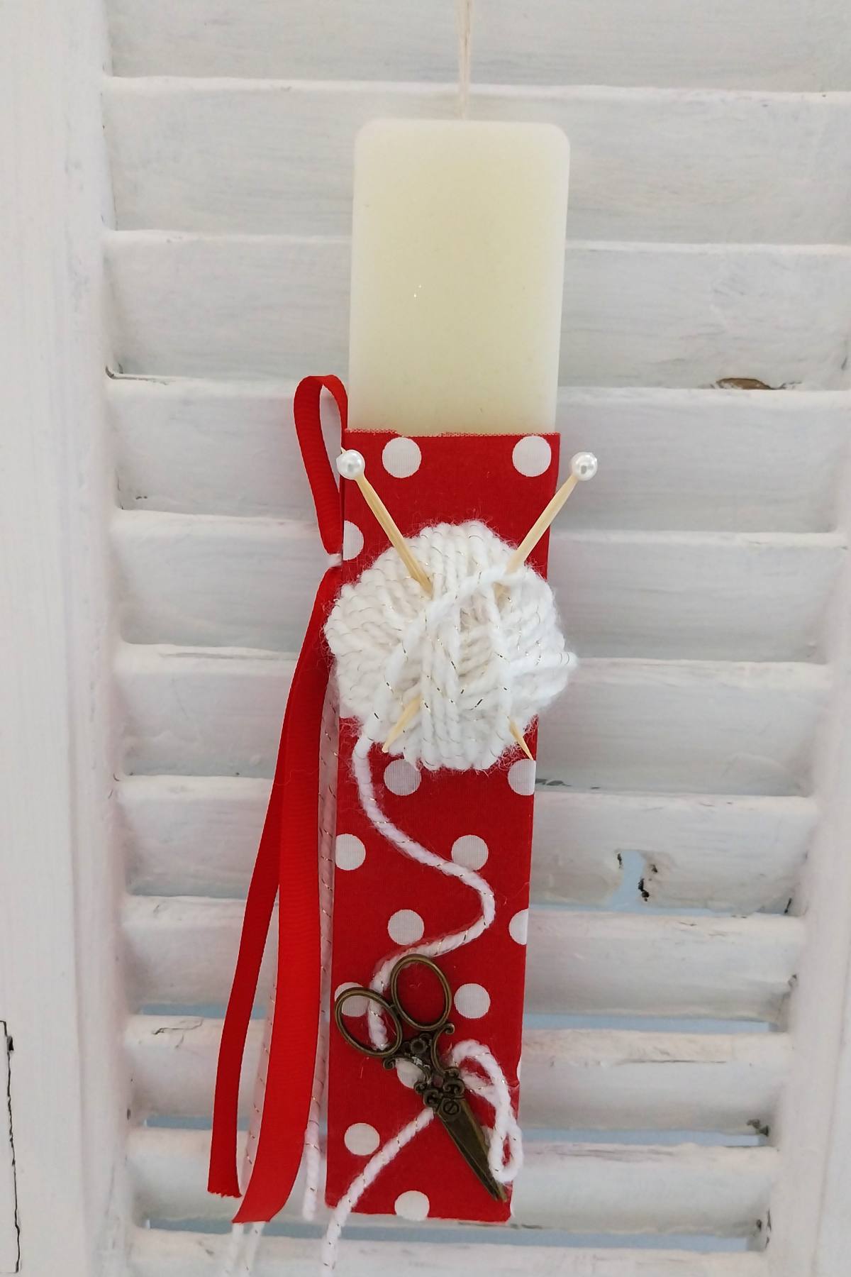 Κοντολάμπαδο αρωματικό στολισμένο με κουβαράκι πλεξίματος και βελόνες