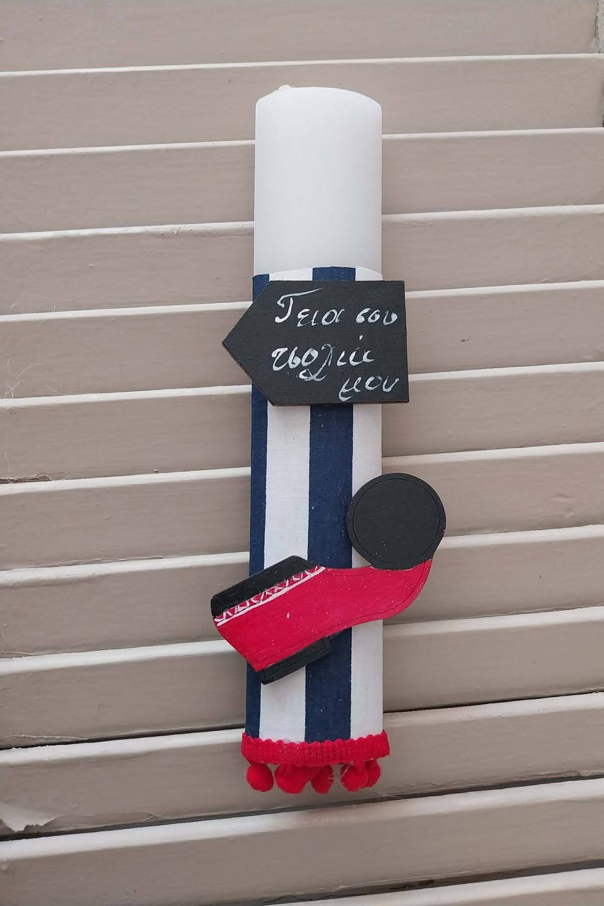 Κοντολάμπαδο διακοσμημένο με επιγραφή και ξύλινο τσαρούχι