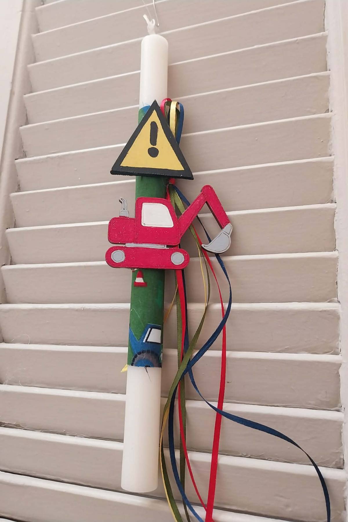 Λαμπάδα 30εκ. αρωματική διακοσμημένη με ξύλινη μπολντόζα και σήμα