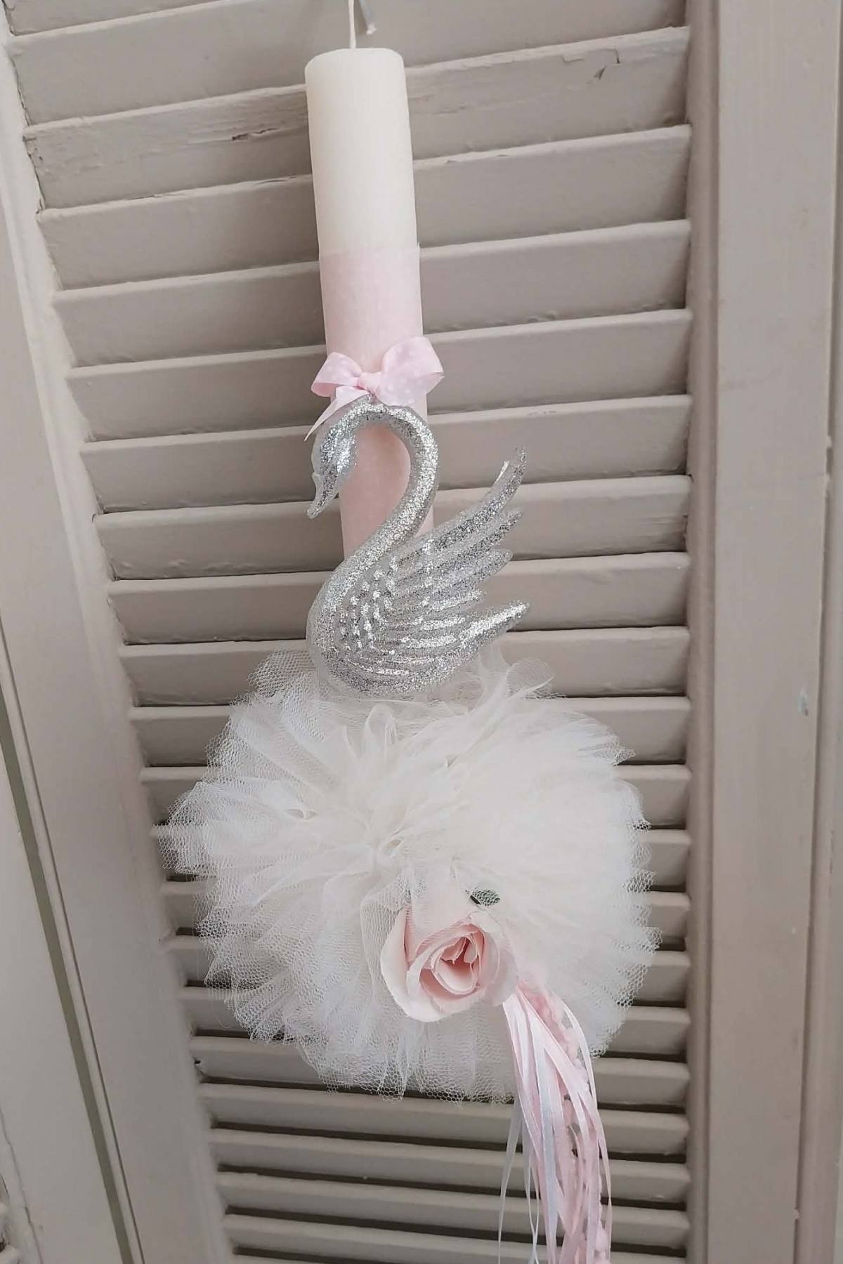 Κοντολάμπαδο στρογγυλό αρωματικό διακοσμημένο με πολυεστερικό κύκνο με glitter και πον πον