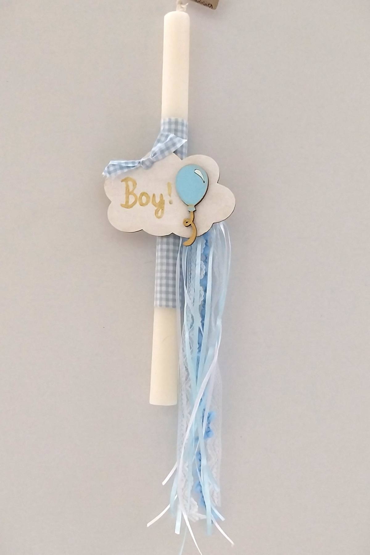 Λαμπάδα αρωματική 33εκ. διακοσμημένη με καρό ύφασμα και στολισμένο με ξύλινα στοιχεία και κορδέλες