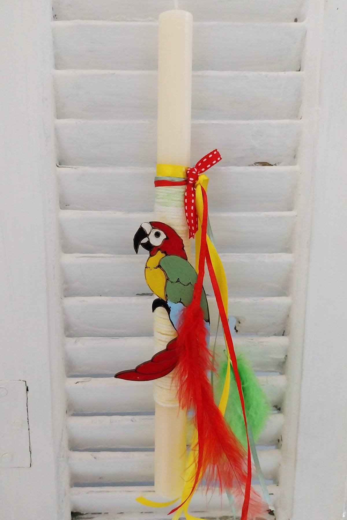 Λαμπάδα αρωματική διακοσμημένη με ξύλινη φιγούρα και στολισμένο με ασορτί κορδέλες και φτερά